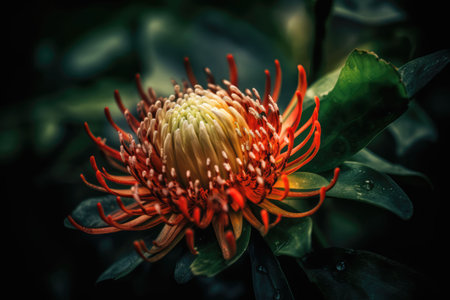 Close-up of a rare protea flower with intricate textures, water droplets enhancing its dramatic look generative ai