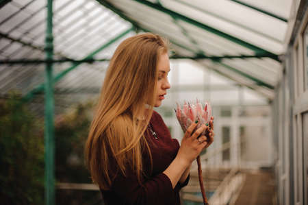 Attractive cute blond woman smelling pink flower with eyes closed in greenhouse