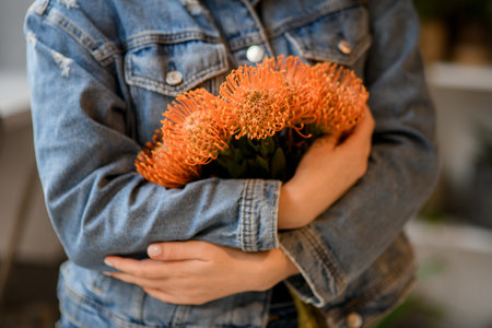great close-up view of beautiful orange flowers of leucospermum in female hands
