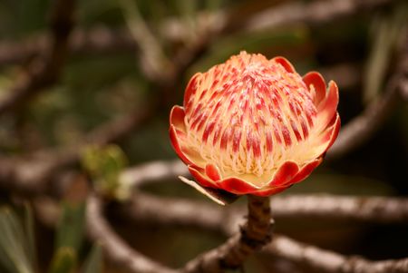 native Australian protea plant with red flower outdoor in beautiful tropical backyard shot at shallow depth of field