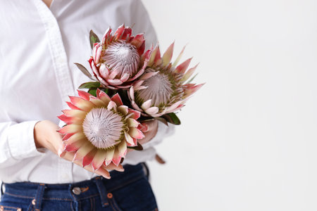 Exclusive blossoming bouquet of pink Protea artichoke flowers in hands of woman