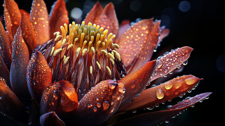 Close-up of a rare protea flower with intricate textures, water droplets enhancing its dramatic look generative ai