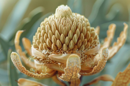 Detailed view of the intricate patterns and structure of a Banksia flower on a plant, displaying vibrant colors and delicate petals up close.