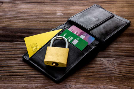 Credit card security concept with lock, wallet on wooden desk.