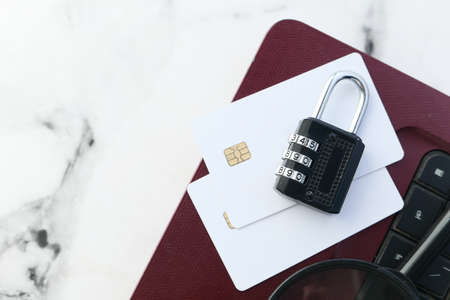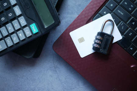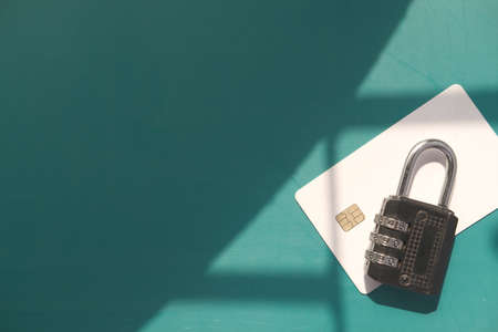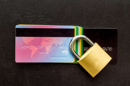 credit card with security lock on black desk top view