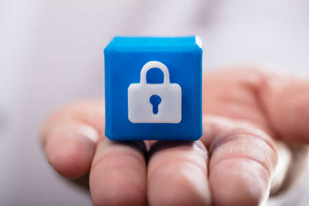 Close-up of a person's hand holding blue cubic block with padlock sign