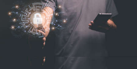 Young man hand touching on virtual Screen Padlock Icon. data protection, information privacy, Cybersecurity, Unlock, internet networking technology concept.