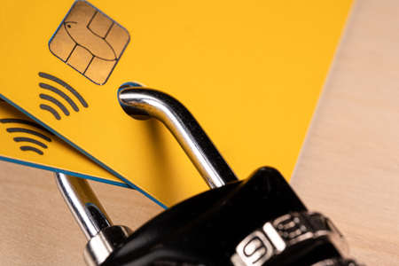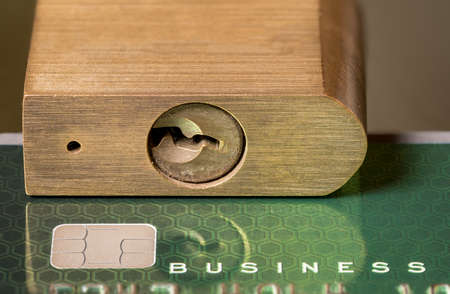 Brass padlock on business credit card with focus on the chip in the card