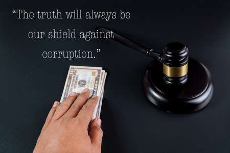 Judge gavel and money on black background. Law and justice concept.