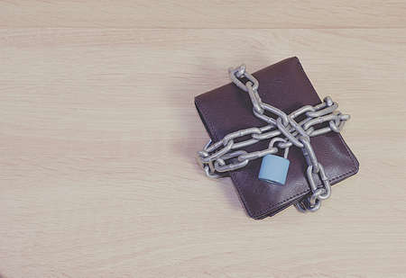 Wallet in chains closed padlock on wooden floor