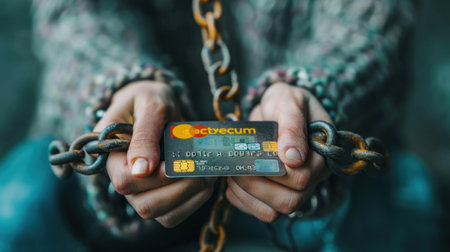 A person is holding a credit card with a chain around their neck, symbolizing debt slavery.