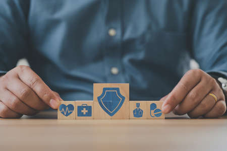 Man hand puts the wooden cubes with icon healthcare medical, Insurance for your health concept.
