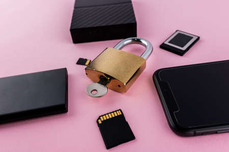 Data protection minimal concept. Flat lay setup on pink backdrop. Lock and data devices.