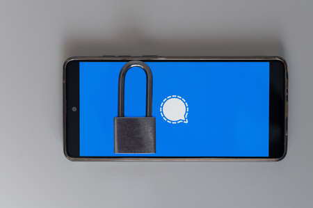 Mobile phone with messenger logo signal and lock on white background.