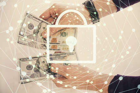 Double exposure of lock drawing hologram and us dollars bills and man hands. Security concept