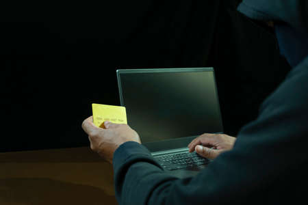 concept of internet theft ,cyber crime.hacker in black hoodie and thief mask using laptop to hack credit card on dark background