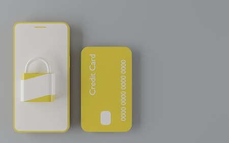 yellow credit card with yellow and white mobile phone and padlock on top on gray background. 3d render