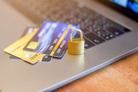 internet safety concept with padlocked and credit card on laptop