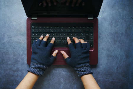 hacker hand stealing data from laptop top down