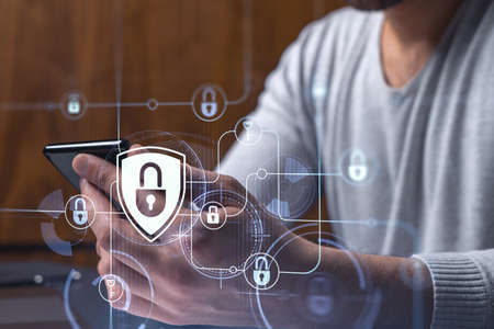 A programmer is browsing the Internet in smart phone to protect a cyber security from hacker attacks and save clients confidential data. Padlock Hologram icons over the typing hands.