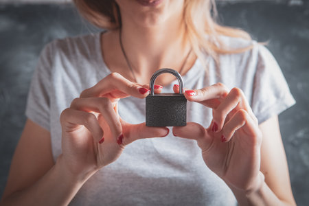 woman holding lock on gray background