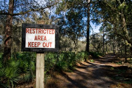 Sign indicating a restricted area in the forest along a path