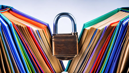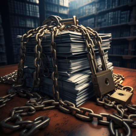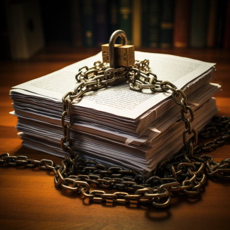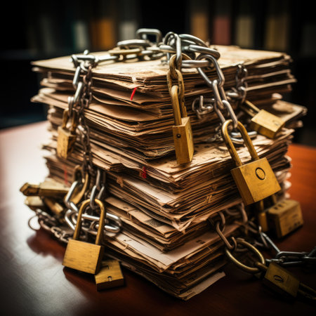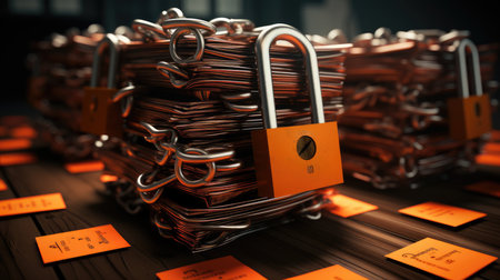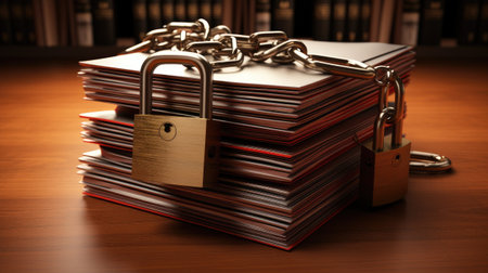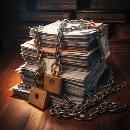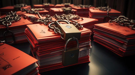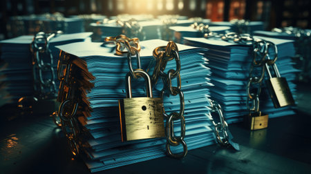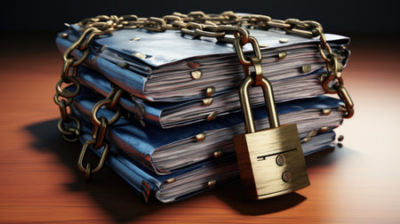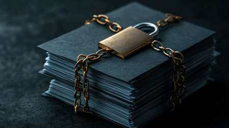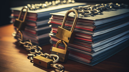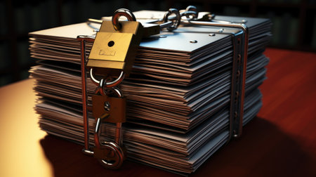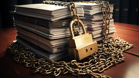 A close-up of documents wrapped with chains and locked with a padlock, symbolizing secure, confidential, and private information protection.