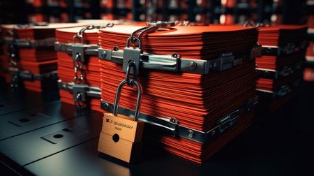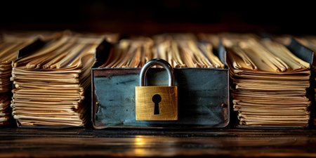 Stacks of secured documents bound with a metal box and locked with a brass padlock, symbolizing confidentiality