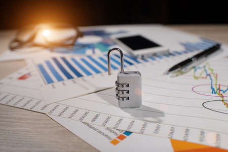A secured stack of documents with a padlock resting on top, emphasizing security and confidentiality in a professional setting