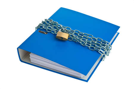Stack of files locked with a steel chain and padlock on top, representing document safety, privacy, and information control.