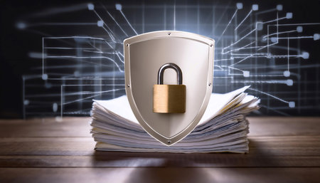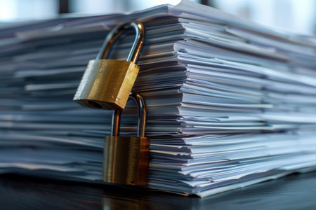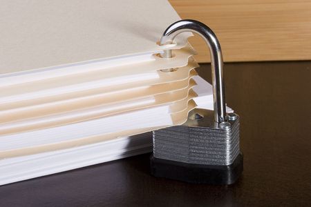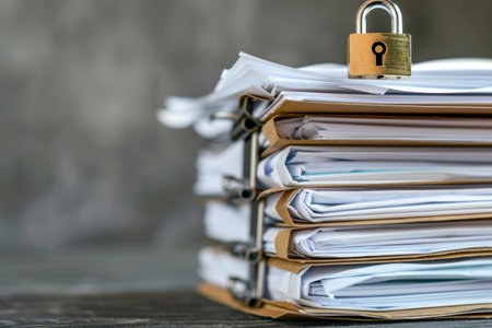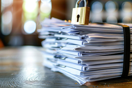 A stack of documents secured with a brass padlock, symbolizing confidentiality and security in a professional environment