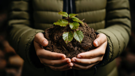ecological concept nature background Detail of a young man's hand holding a green sapling growing from the soil environment, forest conservation concept.