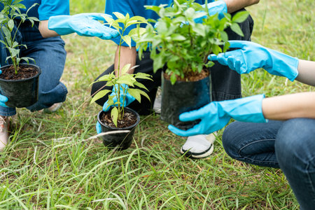 Volunteering Protection of environment and nature ecology concept. Group of volunteer plant a tree Plant trees water them till the soil. Nature for sustainable environment.Global warming concept.