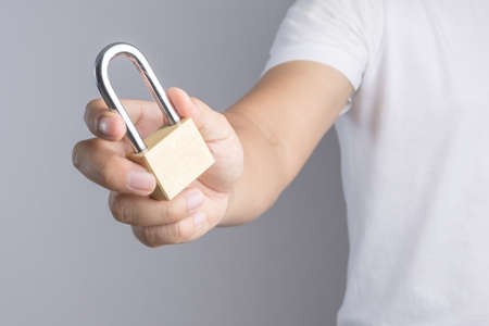 Padlock in womans hand. Data, information, property and security on the Internet concept
