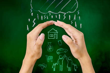 Dreams insured concept. Close up of male hands protecting his dreams from rain on the chalkboard background