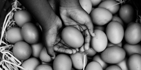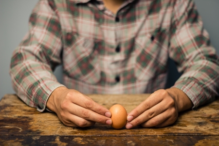 Hand lifts egg from basket in simple wooden environment. Natural light fills space highlighting decision making moment. Concept of food choices, cooking, kitchen.