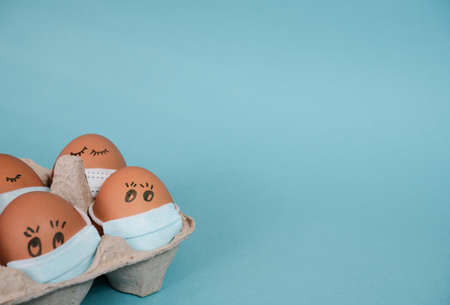 Egg face in medical mask and eggs on blue background. Covid-19 pandemic, self-isolation. top view