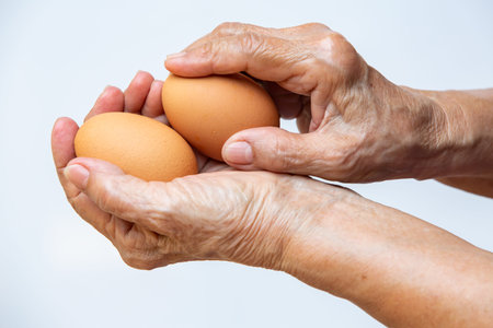 Senior woman's right hands holding two eggs in white background, Healthy food concept, Close up and macro shot