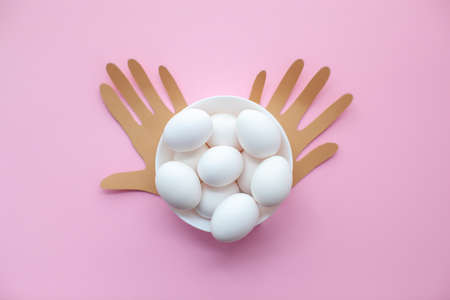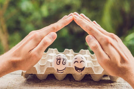 Two eggs - a married couple and two man's open hands making a protection gesture Family life insurance, protecting family, family concepts.