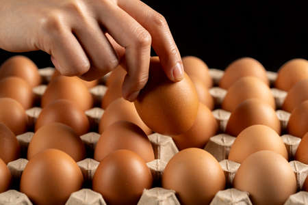 Woman hand choosing eggs on shelf dark scene food backgrounds