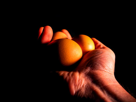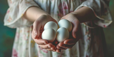 Close up of homemade eggs in womans hand. Female holding three eggs outdoor.