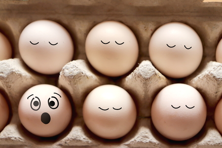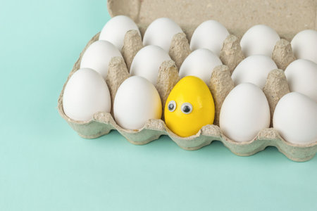 A bright yellow egg with doll eyes looks out of a box with white eggs. Creative image.
