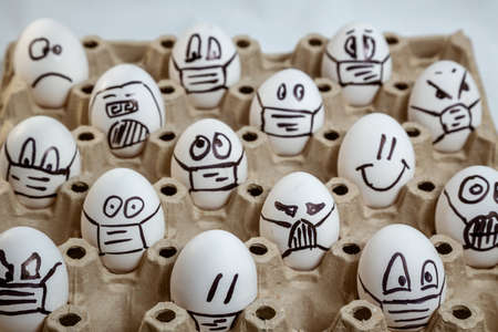 concept of distanced easter holidays. close up of set of Easter eggs with drawn medical masks and emotions. copy space
