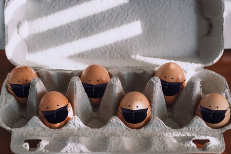 Chicken eggs in medical masks on the face. The concept of the Easter 2021 holiday in relation to the quarantine and self-isolation of the virus.