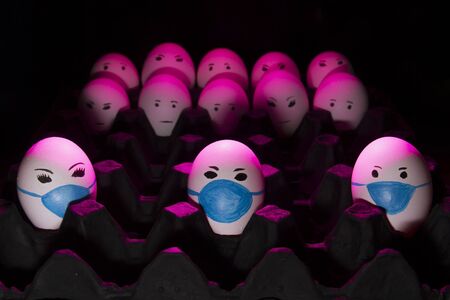 concept of canceling easter because of oronavirus qarantine. close up of chicken easter eggs with doodle scared faces wearing medical masks with white background