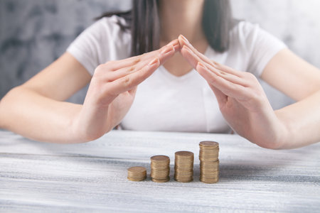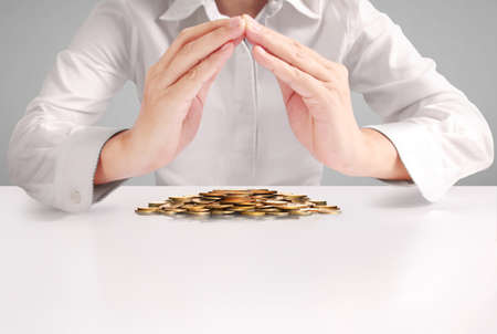 Stack of coin are protected by woman hands. Concept safe custody of cash.