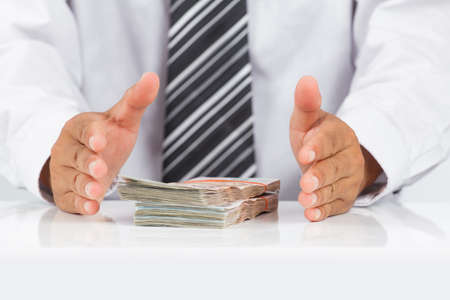 businessman protecting money, financial stability management concept. Savings and pensions, collecting money, financial planning