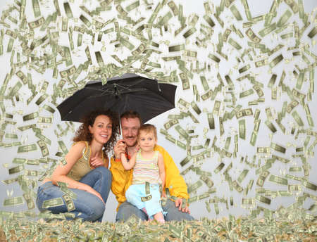 family wih little girl with umbrella under dollar rain collage
