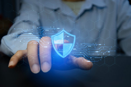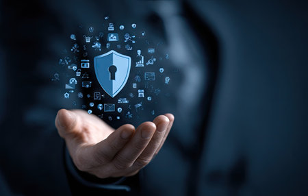 A hand cradles a glowing shield and interconnected icons against a dark background, representing digital security and protection. The composition uses cool blue tones and a soft, diffused light, suggesting a technological or business setting. Ideal for illustrating concepts of online safety, data privacy, and secure transactions.