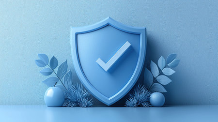 A 3d-rendered illustration of a shield with a checkmark symbol, embodying security and approval on a blue background. Decorative foliage surrounds the emblem.